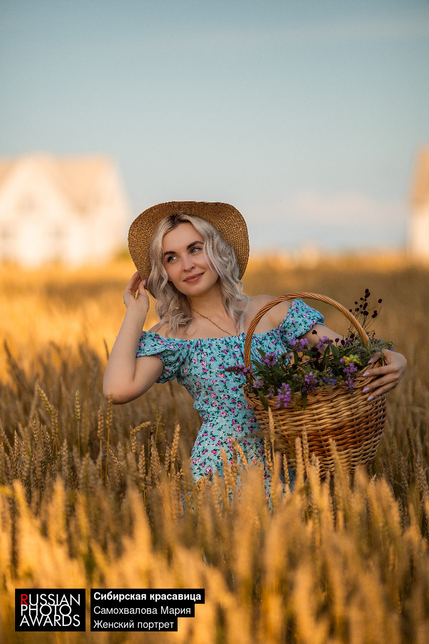 Полевых цветов целая корзина в руках у девушки в шляпке . Спелые колосья пшеницы бескрайних просторов Восточной Сибири встречают ее своим величием .