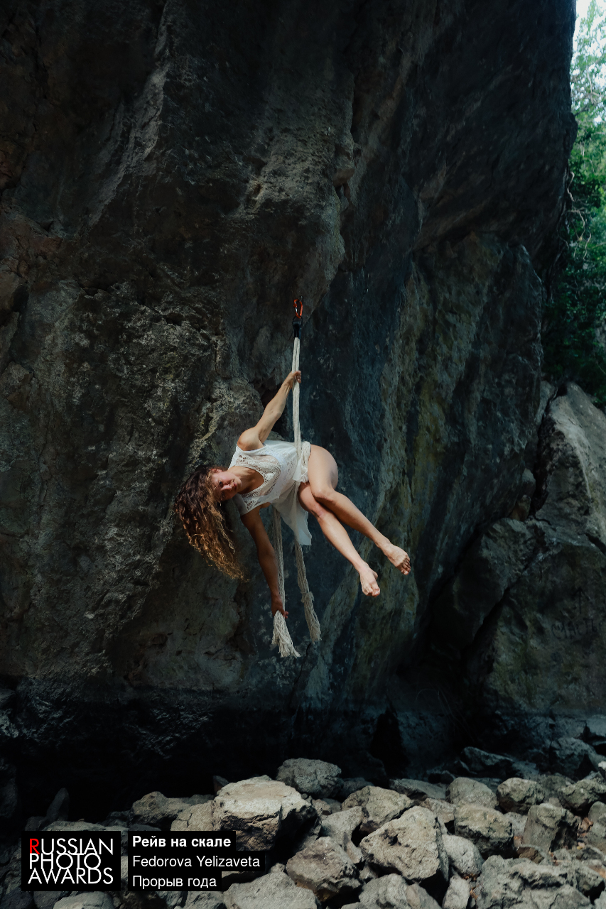 Девушка в белом платье висит на канате на фоне тёмной скалы.