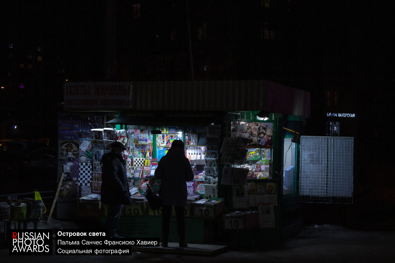 Жизнь ночного города. Маленький киоск становится островком света и жизни в темноте. Силуэты людей, ищущих тепло и человеческую близость в холодную ночь.