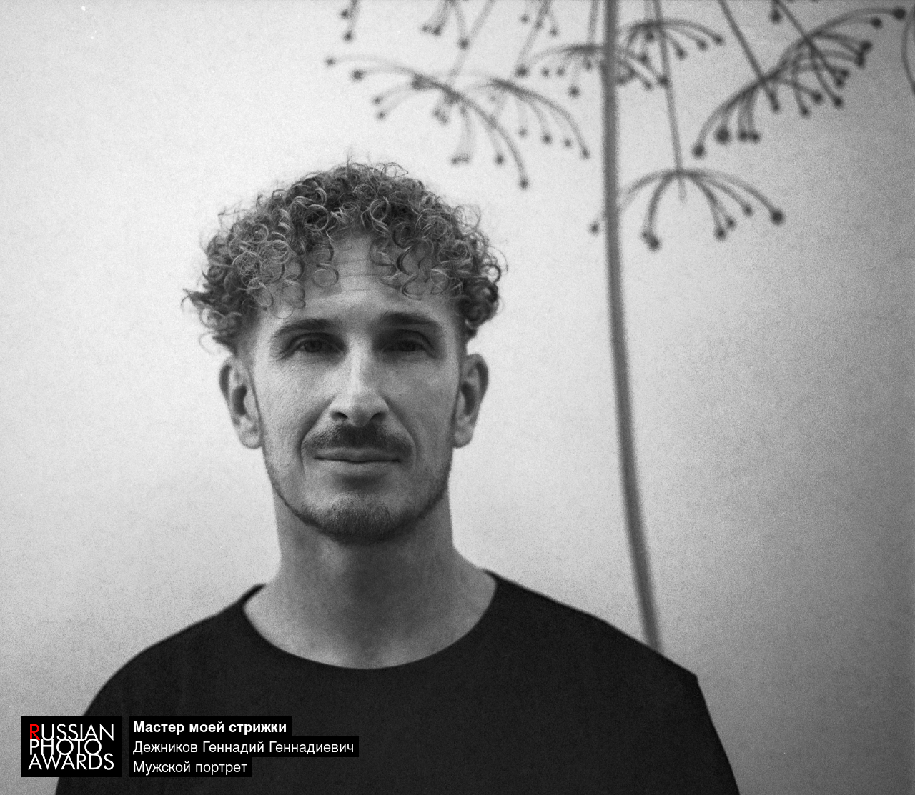 Фото сделано на плёнку. На фотографии изображён мастер по стрижкам, уверенно смотрящий в камеру, будто приглашая доверить ему свою индивидуальность. Его аккуратно уложенные кудри подчёркивают профессиональный вкус и чувство стиля. Чёткие черты лица и спокойное выражение создают образ человека, который ценит детали и стремится к совершенству. Мягкий свет и минималистичный фон усиливают внимание к его образу и ремеслу. Снимок передаёт атмосферу уверенности, творчества и уважения к своему делу.