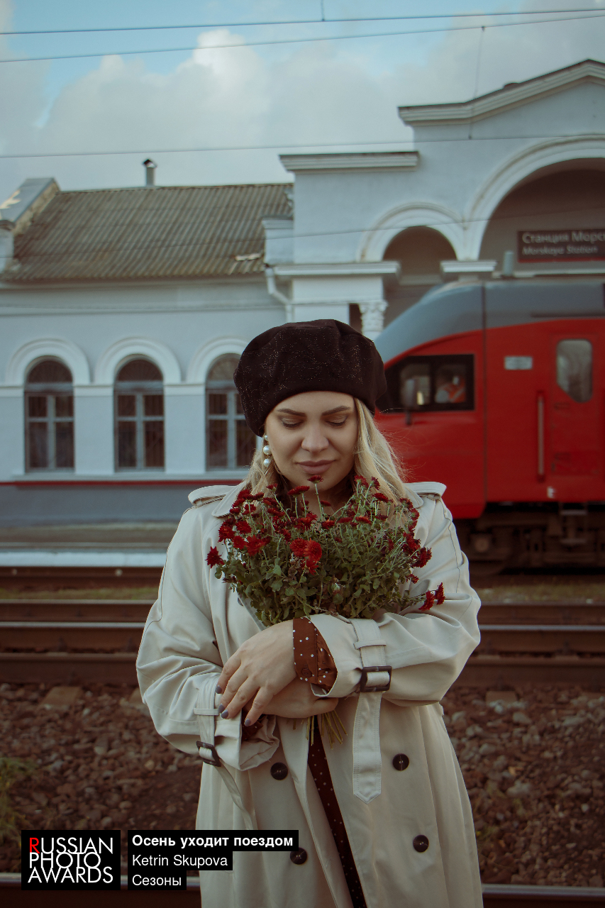 Осень шагает тихо, почти незримо, не в листьях, а в сердце. Её взгляд — тонкая паутина воспоминаний, а в руках — букет хризантем, хрупких, как дыхание уходящего дня. Красный поезд, будто пульс времени, увозит с собой тепло сезона, оставляя за окнами лишь лёгкую грусть и ожидание нового пути — дороги, где ещё не написаны истории и ещё светят невидимые солнца.