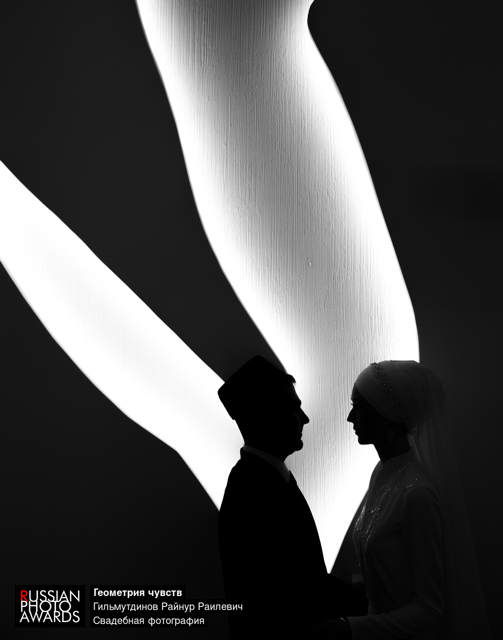 Минимализм и высокий контраст. Абстрактная форма света объединяет профили влюбленных в единое целое.