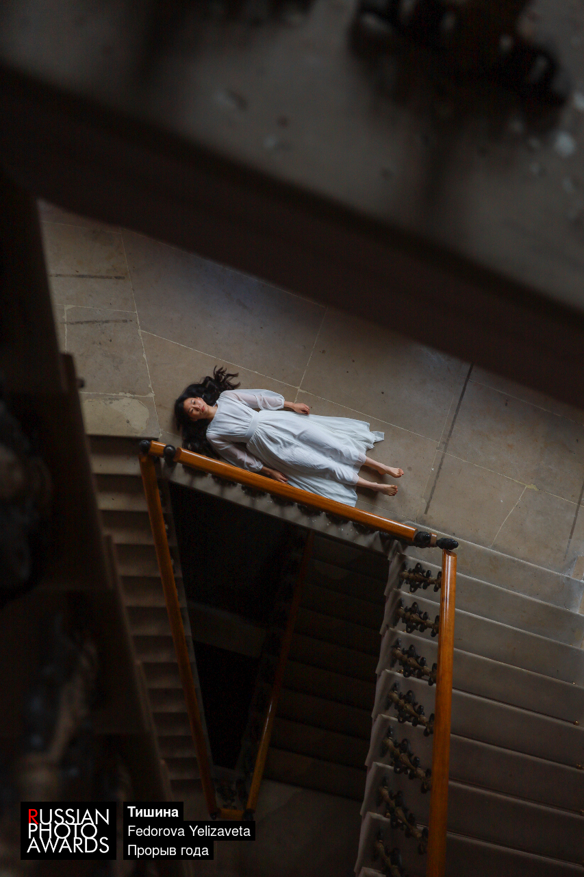 Девушка в белом платье, лежащая на мраморном полу старого особняка, вид сверху старинных перил
