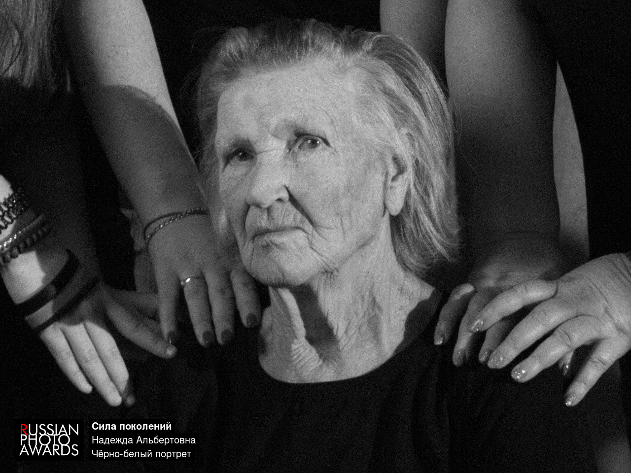 Портрет о преемственности поколений, любви и поддержке. Руки, окружающие пожилую женщину, символизируют заботу и связь между прошлым и будущим. Чёрно-белая гамма подчёркивает текстуру кожи и линии времени, создавая эмоциональную глубину. Свет акцентирует лицо и руки, превращая каждый элемент кадра в визуальный язык опыта, тепла и мудрости.