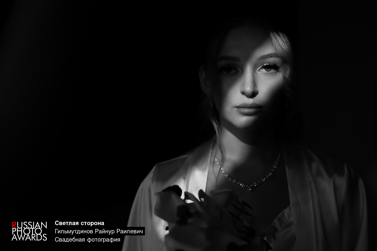 Арт-портрет. Тень здесь работает как инструмент, отсекающий суету и фокусирующий внимание на магнетизме взгляда невесты. Эстетика минимализма.