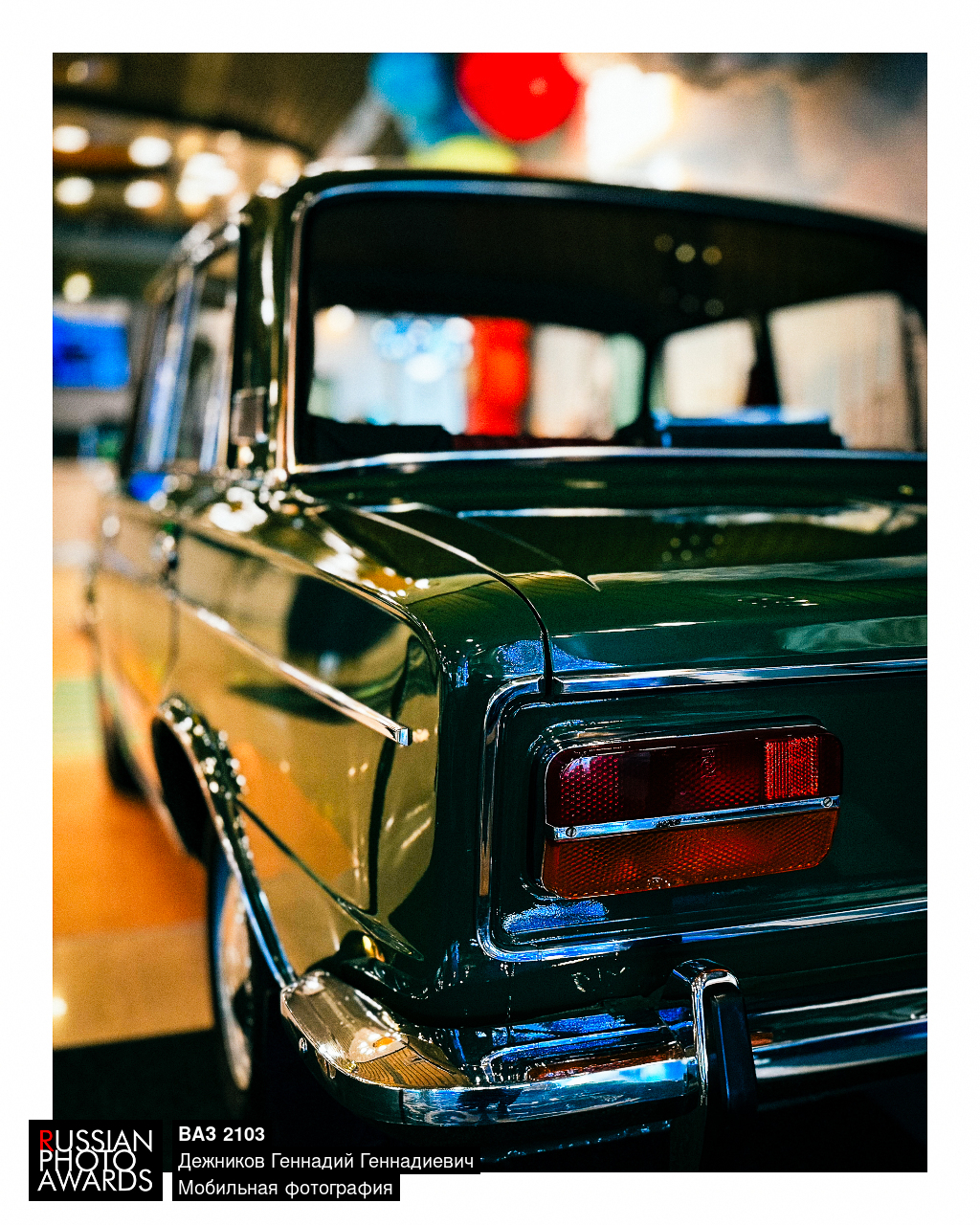 Фото снято на iPhone 15 Pro Max. Полированное зелёное крыло классического автомобиля сияет под мягким светом зала, отражая сотни цветных огней, словно драгоценный металл. Изящные линии кузова подчёркивают характер эпохи, когда машины создавали не только для движения, но и для восхищения. Холодный блеск хрома контрастирует с тёплыми оттенками фона, создавая ощущение живого дыхания техники. Узнаваемая форма заднего фонаря превращается в акцент, удерживая взгляд и добавляя кадру ностальгическую глубину. Эта фотография — история о времени, которое можно услышать в каждом отблеске.