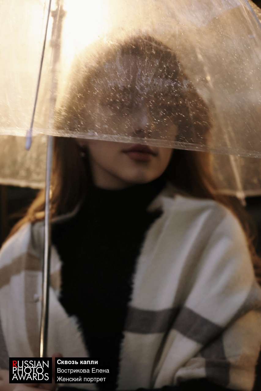 Сквозь дождевые капли на прозрачном зонте — взгляд, полный тишины и тепла. Золотой свет фонаря окутывает лицо, скрывая глаза, но выдавая настроение: задумчивость, уют и таинственность. Красота в мелочах: в каплях, в тени, в том, что остается за кадром.
