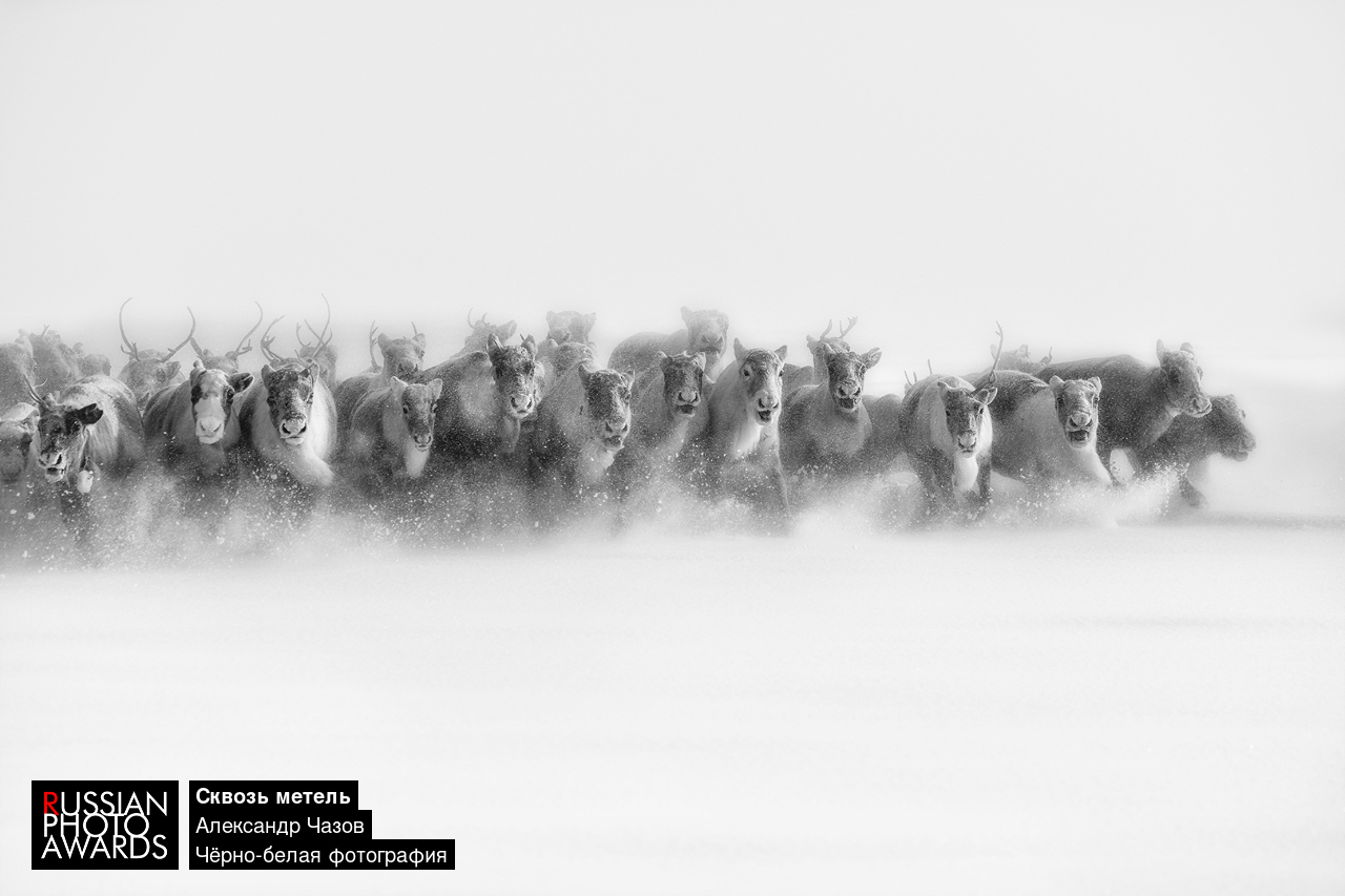 Стадо северных оленей надвигается в поднимаемой снежной пыли и горячем дыхании, словно в тумане по тундре.