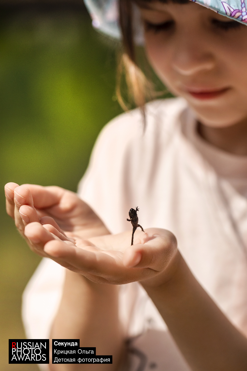 На прогулке. Застывший момент дочки и лягушонка.