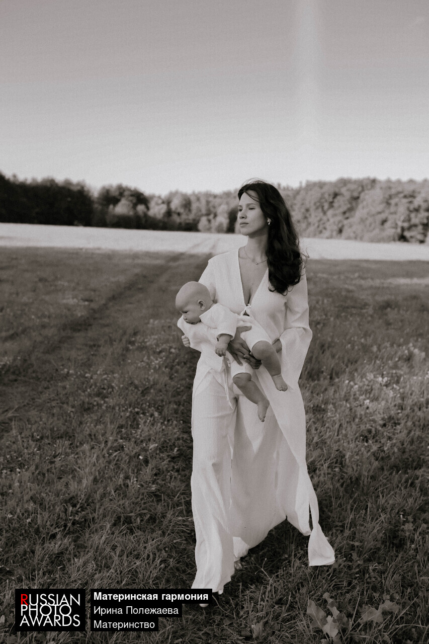 Мать держит малыша на руках, прогуливаясь по просторному полю - момент тишины и нежности