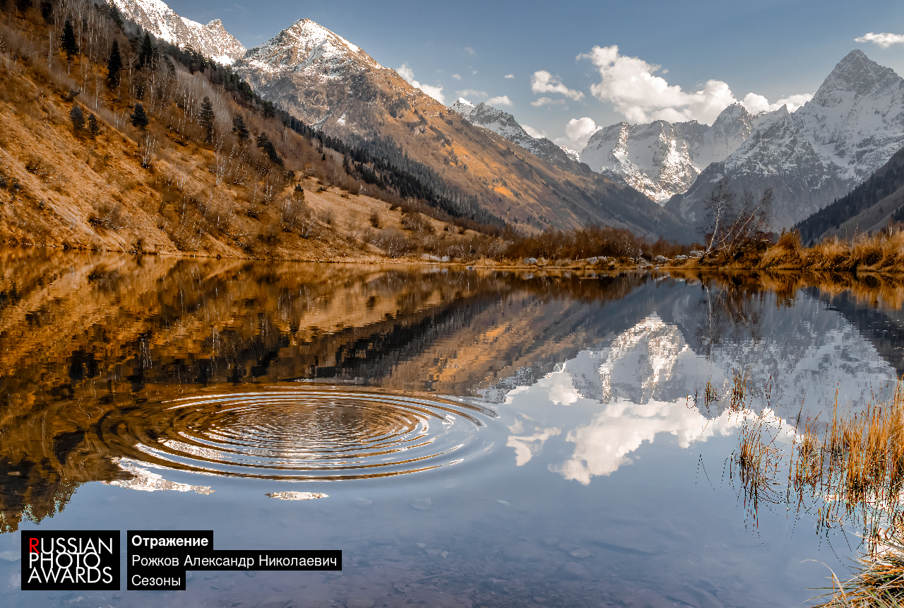 Фотография снята осенью 2025 года в ущелье Гоначхир в Домбае. Вечером был абсолютный штиль, чтобы создать план и показать воду озера Туманлы-Кёль, пришлось создать рябь на воде в виде кругов от брошенного камушка. Озеро, само по себе, вытянуто вдоль долины, по левому его берегу проходит асфальтированная часть Военно-Сухумской дороги. Место крайне популярно у туристов и привлекает, с одной стороны, своей доступностью, с другой - непередаваемыми видами на грозную стену Клухор-Баши, расположенную в Главном Кавказском хребте, с её снежниками и ледниками.