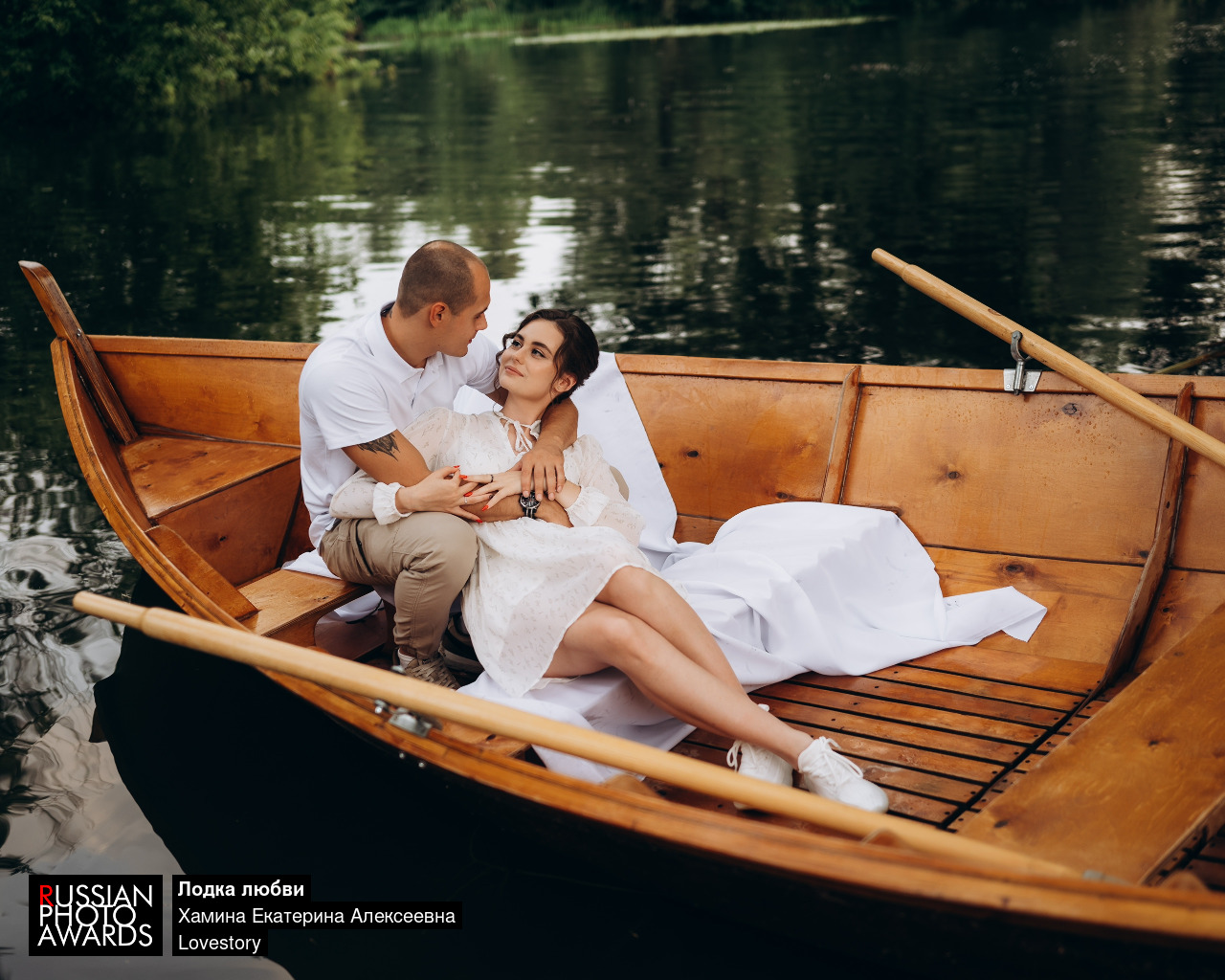 Романтическая пара уютно устроилась в традиционной деревянной лодке посреди тихого озера, окруженного густой зеленью. Женщина лежит на белом покрывале, ее платье развевается легко, а мужчина нежно держит ее за талию, их взгляды полны любви и спокойствия. Мягкий дневной свет подчеркивает теплые тона дерева лодки и бирюзовую воду, передавая ощущение уединения и гармонии вдали от суеты.