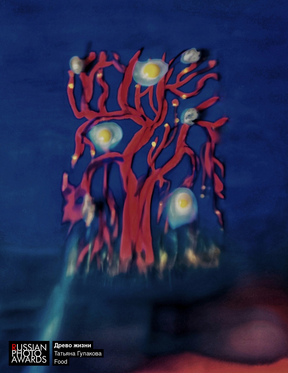 Его ветви, удлиненные и причудливые, тянутся вверх, будто тоскующие руки, а на них, словно драгоценные плоды, покоятся глаза утреннего солнца – жареные яйца. Белые белки, как нимбы, окружают золотистые желтки, обещая тепло и начало дня.