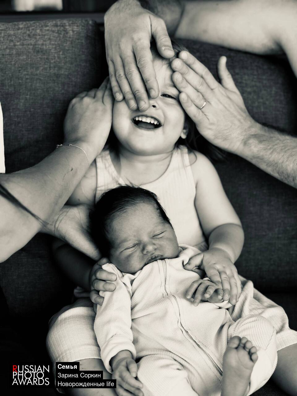 Пускай кадр чёрно-белый, но в нём столько красок: смех девочки, сон младенца, забота родителей. Это мгновение — как вечность. Семья не требует постановки: достаточно улыбки и прикосновения, чтобы родилась история о любви.